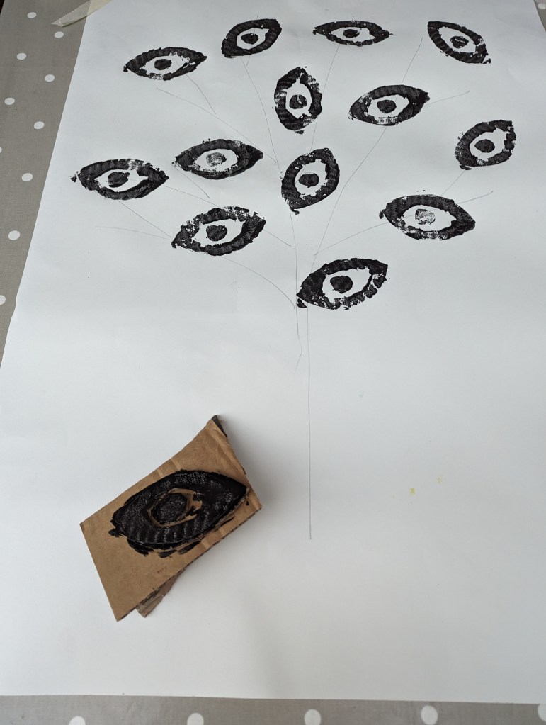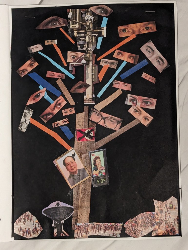 using my a4 collage as an idea I decided to print, draw and, collage a large tree called MataMata. ( mata means eyes in Malay, to make a plural double the word, it then means Police)