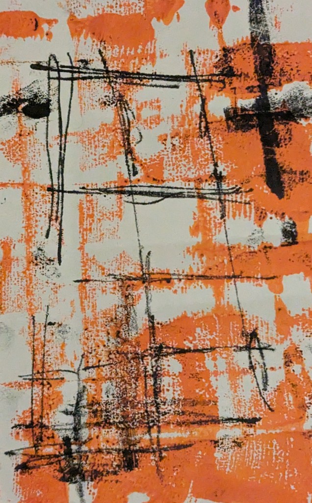 After a day learning how removing ink by wiping is the essence of dry point printing, we were sent away to explore the joy and frustration of monotype. Using a inked surface, paper laid on top and marks made , with fingers, pencils brushes, an impression is made and the results are remarkable.