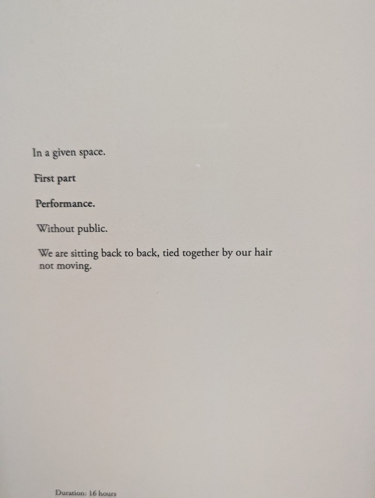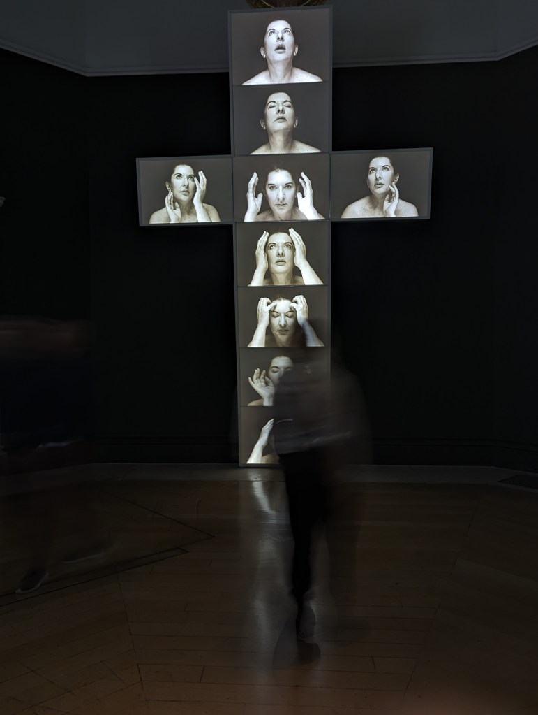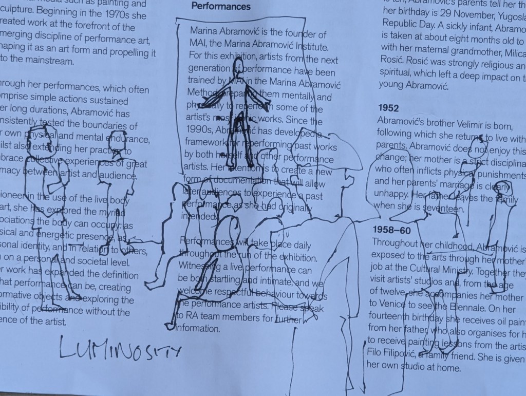 these actions are described in short instructions, enabling the work to be repeated by other ‘actors’. Currently Abramovic trains young artists in breathing techniques, and to remain motionless for hours. Two were posed naked in a doorway between galleries prompting participants to squeeze between them in a too familiar way. Another posed on a wall as a living naked crucifiction