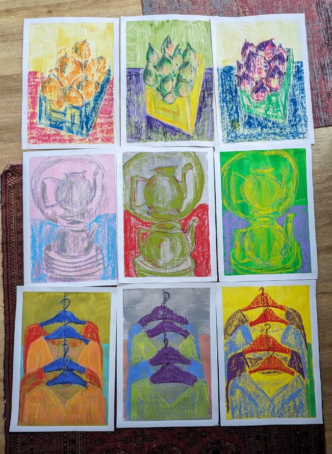 I also have one large wall opposite Diana’s floral exhibit where I hope to hang my nine coloured pastes, a tribute to the range of goods in the market. A shameless tribute to Warhol, especially as the pastels give an impression of silk screened prints