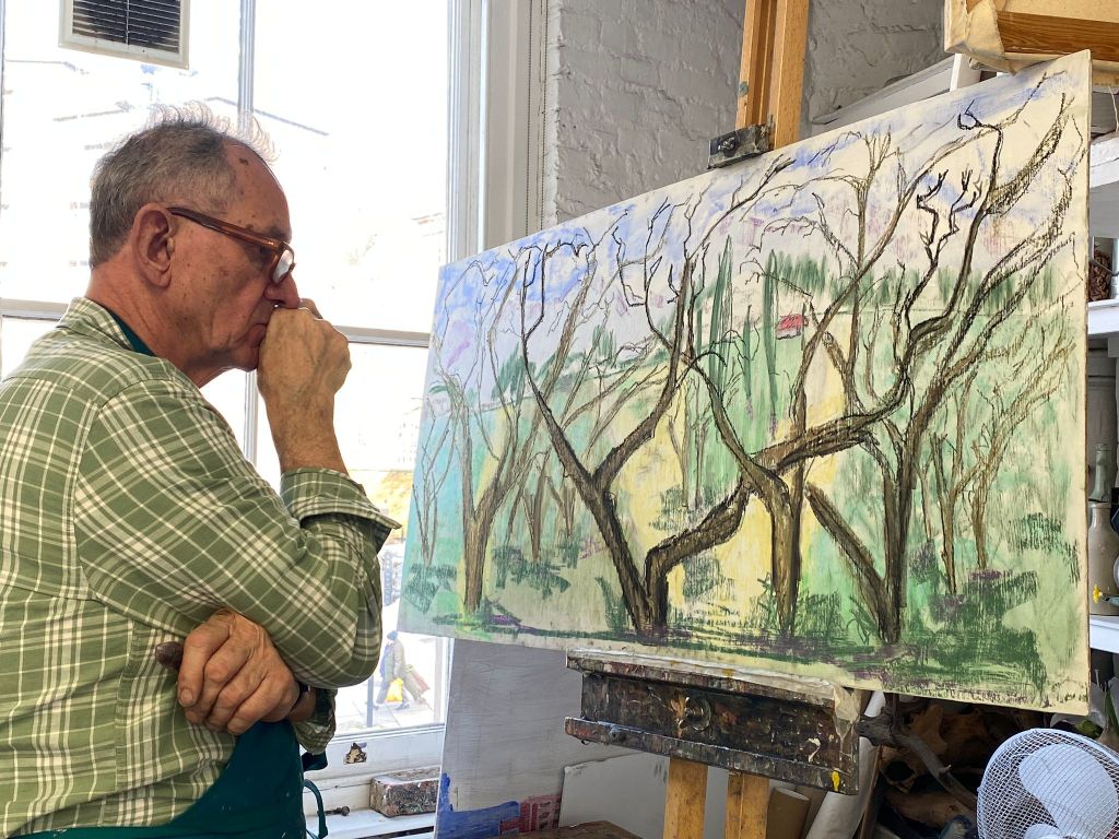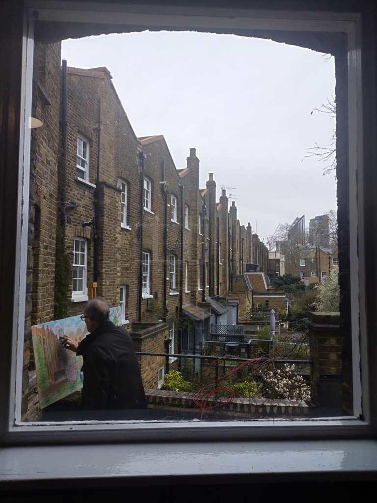 for my third board I went outside on a beautiful spring morning and painted the scene from the studio balcony. It was very intersting to track the movement of light during the day, from trees in bsilhouette in bright morning sunlight to the the even overcast light of the afternoon.