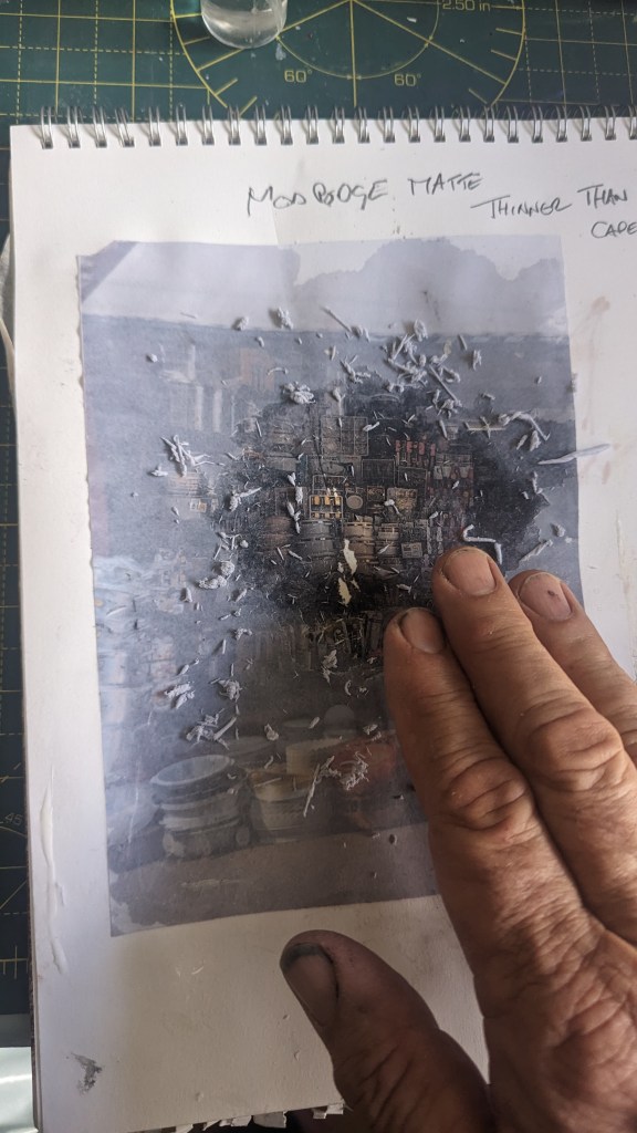 I used modge podge, a proprietary glue used specifically for image transfer. I spread it in a colour laser print on good quality printing paper.